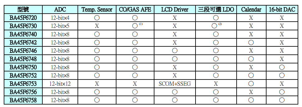 Holtek CO/GAS 探测器 MCU 包含 BA45F67xx 系列及 BA45F68xx 系列。其中 BA45F67xx 系列包括 BA45F6720BA45F6730BA45F6740BA45F6742BA45F6746BA45F6748BA45F6750BA45F6752BA45F6753BA45F6756BA45F6758。而 BA45F68xx 系列包括 BA45F6830BA45F6840BA45F6846BA45F6850BA45F6856